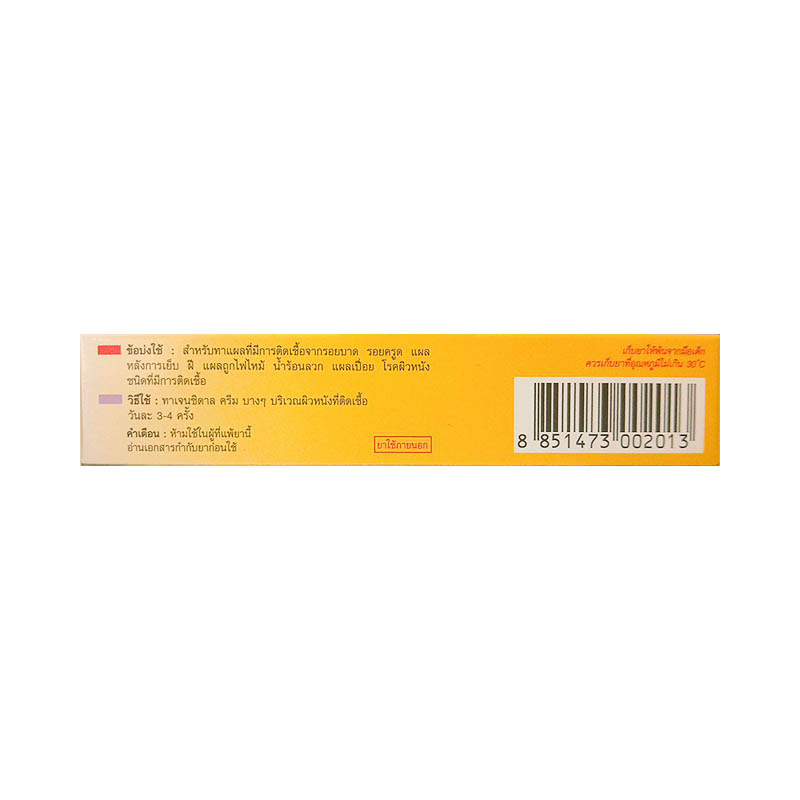 • สำหรับทาแผลที่มีการติดเชื้อจากรอยบาด รอยครูด แผลหลังการเย็บ ฝี แผลถูกไฟไหม้ น้ำร้อนลวก แผลเปื่อย โรคผิวหนังชนิดที่มีการติดเชื้อ
