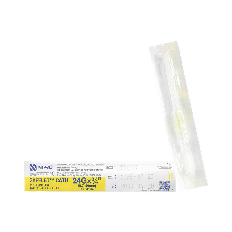 เข็มให้น้ำเกลือ Nipro (เหลือง) Safelet cath 24Gx3/4″ / กล.50ชิ้น